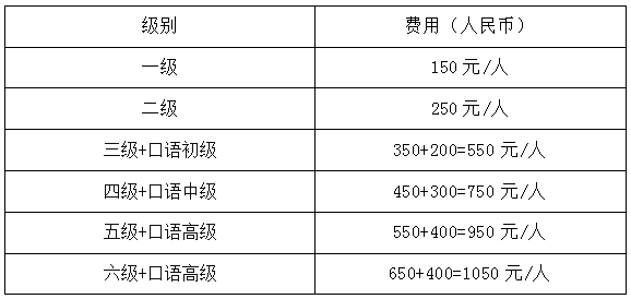 (以上费用仅为HSK和HSKK考试的报名费,不包含成绩单邮寄等其他费用)